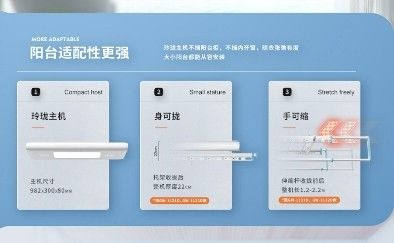 同时,这款拥有“玲珑主机”的小巧型晾衣机,晾杆可伸缩,适配性非常强,大小阳台都能用,绝对是对于小户型阳台的首选。而且,它还能根据天气的变化进行自适应调整,当空气湿度较高时它会自动开启智能烘干功能,保证衣物干干爽爽不发霉。