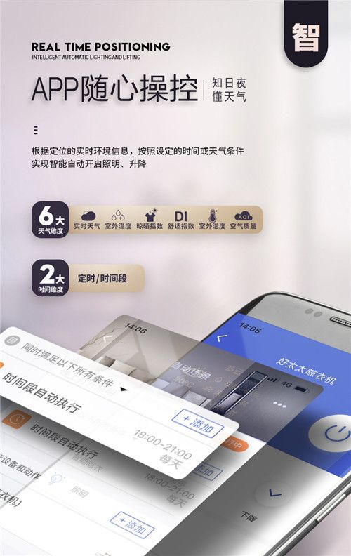 同时,这款超薄晾衣机还设计了很多贴心的功能,比如它可以通过app自定义晾晒模式,根据实时环境信息,智能控制,自动开启照明和升降功能。