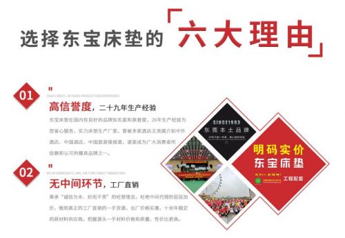 酒店床垫要选择有实力的专业品牌。东宝床垫是东莞28年本土品牌,自1993年成立以来,一直专注于研发、设计、生产、销售以床垫和软床为核心的高品质寝具。主营酒店工程和民用寝具业务,在全国拥有多家连锁直营店和数百家加盟店,产品远销欧美地区,与全球范围内多家酒店集团均有合作。