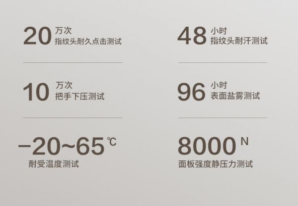 除了使用体验出色外,TCL智能锁的质量也是毋庸置疑,TCL 每一把智能锁出厂前都需经过6大维度的品控测试,包括20万次指纹头耐久点击测试、48小时指纹头耐汗测试、 10万次把手下压测试、96小时表面盐雾测试、-20℃-65℃耐受温度测试、8000牛顿面板压强测试等,让每一名用户享受到稳定可靠的卓越品质!
