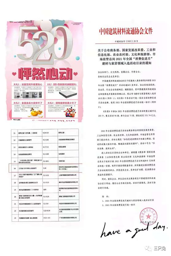 2021年消费促进月活动由商务部、工信部、发改委、农村部、文旅部、市场监管总局共同发起,旨在进一步激发市场活力,释放消费潜力,巩固消费回升向好势头,服务构建新发展格局。三只兔520怦然心动装修节入选活动目录,是通过促进家装消费,带动相关产业消费的引导者,这是三只兔连续两年入选消费促进月活动目录,也是三只兔实力的说明。