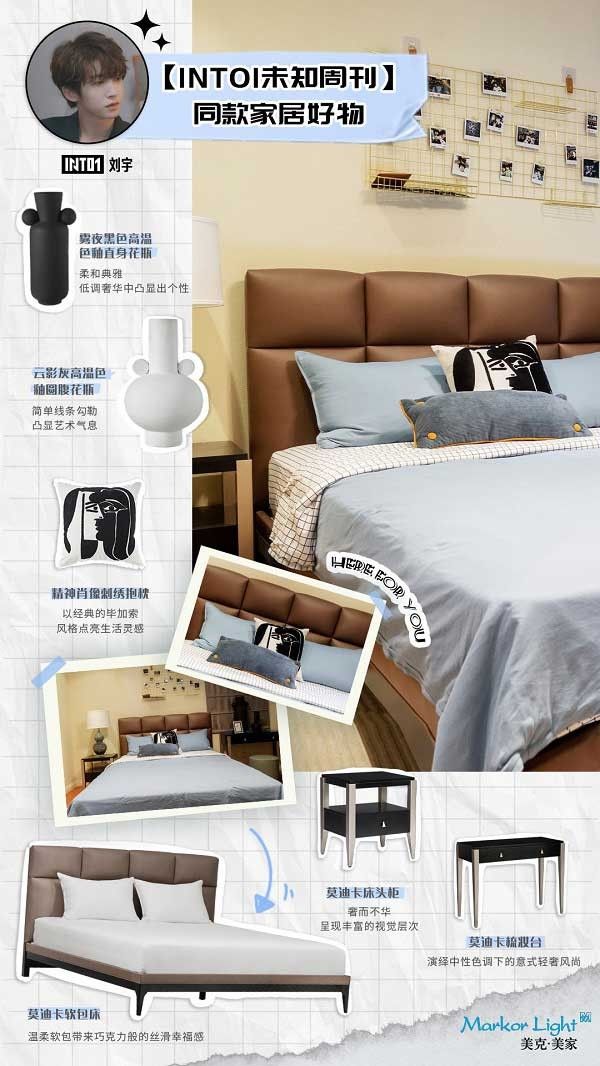 以INTO1队长刘宇为例,作为一个不折不扣的精致美少年,他在忙碌日常中也不忘敷面膜上班,会特意提前一小时起床整理,对待生活的认真程度可见一斑。然而,“造化弄人”,INTO1刘宇被分到的房间却略显简陋,铁栏杆式的床头,被他自嘲“刚好卡头”。在得知了弟弟想要“巧克力床头”的心愿后,Markor Light专门为其换上软包床,让他在每个清晨醒来后都能与浪漫不期而遇。同时,考虑到弟弟平时需要化妆和玩电脑,加之其香水爱好者属性,Markor Light分别添加了梳妆台、书桌和层架等家具满足生活所需,还铺上地毯,搭配吊灯和台灯等家具,将宿舍打扮得情调满满。难怪改造后的宿舍受到了粉丝们的集体点赞:“细节好评”、“十分用心”。