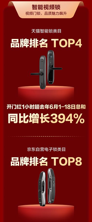 得益于萤石在智能门锁领域的升级与突破,萤石智能门锁产品一如既往,大显黑马本色。天猫智能锁类目位列第四名,开门红1小时超去年6月1-18日总和,同比增长394%,京东自营电子锁类目进入前10榜单。仅需一把萤石智能锁,就能体会多开锁方式和APP智能管理的便捷,感受门外可视、徘徊告警的安全保障,再享全国免费安装的优质服务。