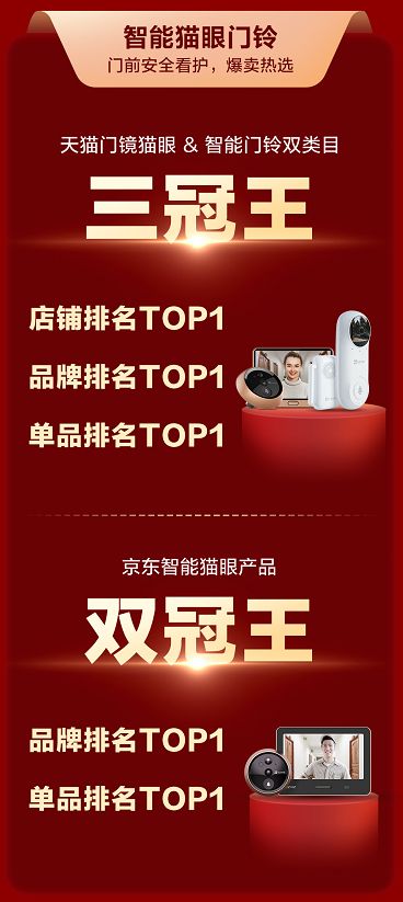 人们对安全的需求持续走高,萤石智能入户产品为用户带来很大的惊喜。数据显示,萤石问鼎天猫门镜猫眼&智能门铃双类目店铺、品牌、单品TOP1,同时拿下京东智能猫眼类目品牌、单品排名TOP1。