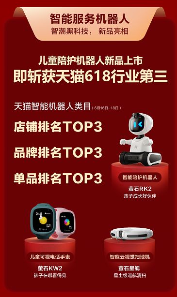在科学陪伴、快乐成长的理念指引下,越来越多的年轻父母选择在618为孩子入手一台儿童机器人。618高潮期16-18日,天猫数码旗舰店的儿童机器人产品进入天猫智能机器人类目中店铺、品牌、单品TOP3阵营,儿童陪护机器人RK2新品上市三个月即斩获天猫618行业第三。