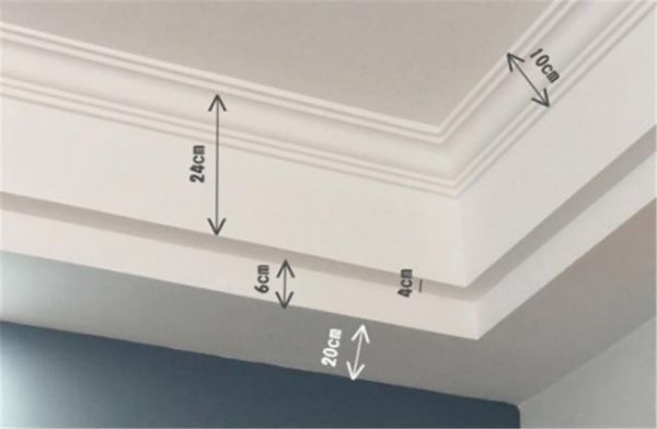 在做双眼皮吊顶时注意测量好尺寸,一般来讲,双眼皮吊顶下吊30cm,宽20cm,石膏线10cm,不懂可参考图中所示。