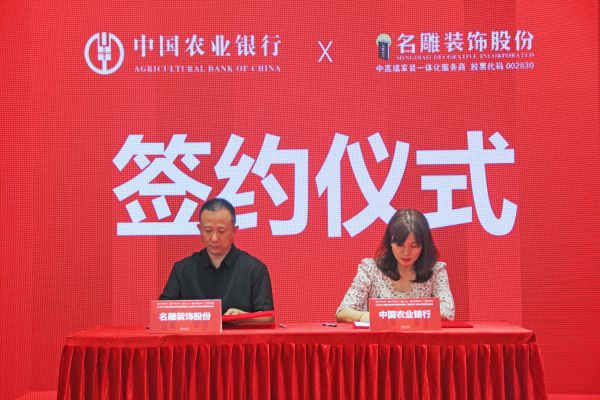 6月18日,工、农、中、建四大银行携手名雕装饰股份“家装分期”签约仪式暨新闻发布会,在名雕美家世邦建材体验馆成功举办。
