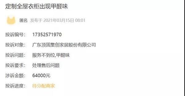 今年3月份,编号为17352571970的消费者在黑猫投诉表示,“2018年10月13日,从广东顶固集创家居股份有限公司定制了64000元衣柜,至今为止衣柜还出现甲醛味,反映多次,投诉多次,至今售后不理睬,一直在敷衍,到现在已经2年多时间了,长期有味道存在,经常闻起来导致头晕呕吐”