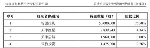 据招募书显示,2020年12月7日,远超智慧经历最后一次增资后,最大股东为智领投资,持股比例76.5%。天津红星美凯龙世茂家居有限公司持股比例4.344%,为远超智慧第二大股东,天津居然智居股权投资基金合伙企业(有限合伙)持股比例3%,为公司第三大股东。云猫投资持股147.5万股,持股比例2.26%,为公司第四大股东。
