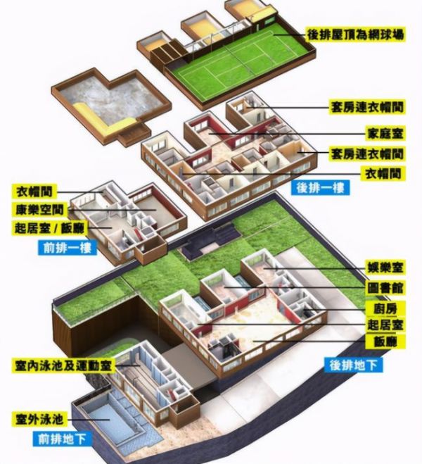 这栋豪宅几乎占了整个山头的位置,地理环境十分优越,而且她家并不是由一个房子构成的,是多个建筑群体。室内的各种设备都十分完善,其中包括了私人游泳池,卧室,餐厅,运动室,康乐空间,衣帽间等等,天台还被改成了一个网球场,空间被用到了极致。可能在香港这种人多地少的环境下,很多家庭建筑都是空间利用感很强。