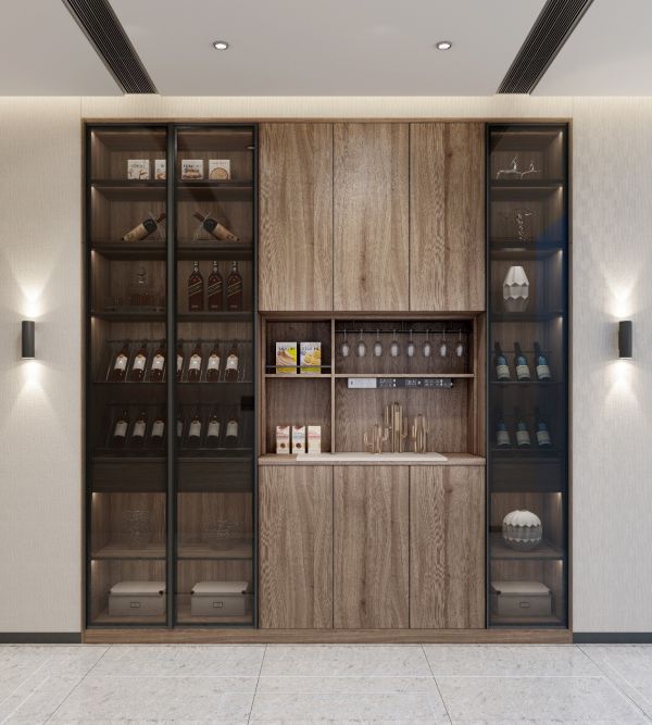 产品多采用悬浮式设计,搭配通透的茶色玻璃以及柜类灯带,巧妙避免了因木纹使用过多带来的沉重感,在视觉上更轻盈有质感,并且在日常清洁的时候也更加方便。