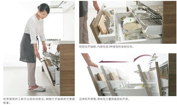好的歌声让人身心愉悦,给人满满的正能量,好的厨房产品也能够帮助你找到理性与感性交织的烹饪乐趣,为美妙的烹调时光增添色彩。骊住厨房轻松抽,橱柜门可倾斜拉出,省力达30%,不用练出麒麟臂,便可轻松取出所需物品。需要时,亦可极大限度拉开收纳柜,使内部厨具一览无余,想拿什么一眼就看到了。