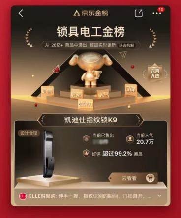 在京东渠道,此次618期间,凯迪仕3D人脸识别智能锁行业第一,K9智能锁从26亿+商品中脱颖而出,霸榜京东金榜C位,获京东金榜·锁具电工金榜。