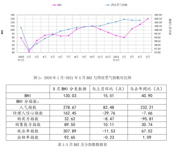由商务部流通业发展司、中国建筑材料流通协会共同发布的全国建材家居景气指数BHI 5月份全国建材家居景气指数(BHI)为130.03,环比上涨15.51点,同比上涨40.90点。全国规模以上建材家居卖场5月销售额为985.9亿元,环比上涨12.75%,同比上涨52.33%;1-5月累计销售额为3840.9亿元,同比上涨82.23%。