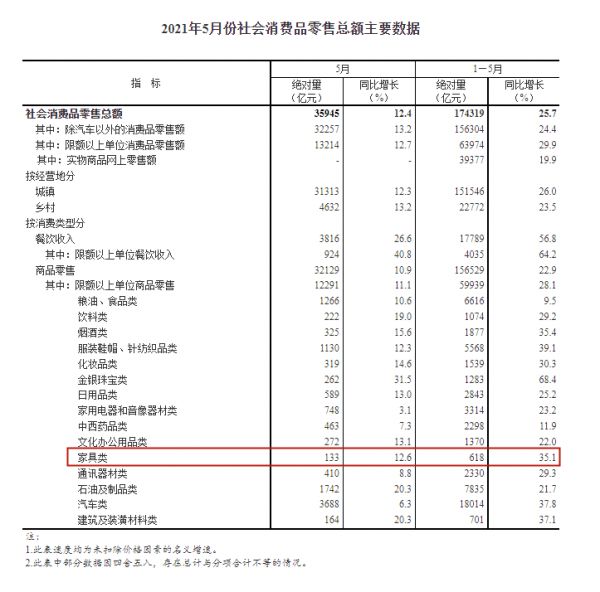 5月家具类商品零售总额133亿元,同比增长12.6%