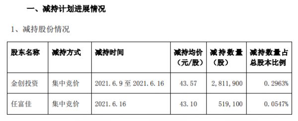 其中,金创投资于2021年6月9日-6月16日,以43.57元/股的股价合计减持281.19万股,任富佳于2021年6月16日,以43.10元元/股的股价合计减持51.91万股。