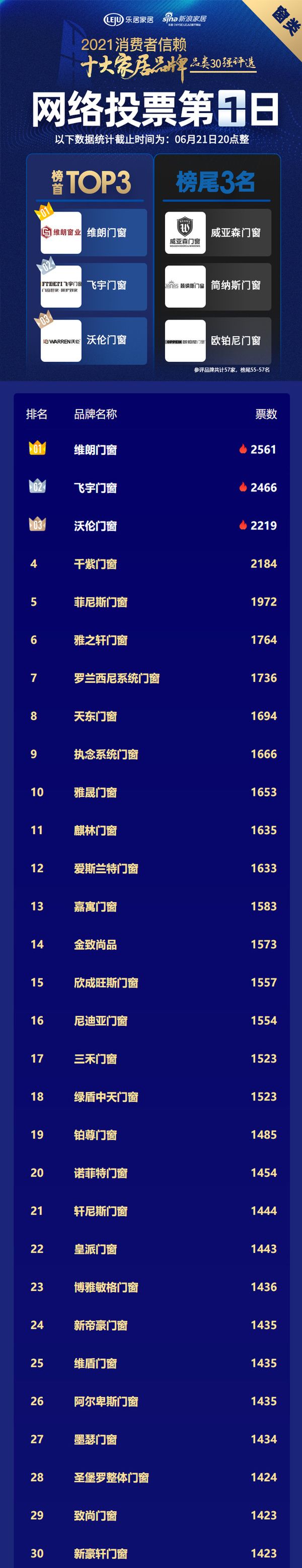 截至6月21日20时,网络票选第一日战况出炉,窗类首日收获约8.2万票,首日三甲分别为维朗门窗、飞宇门窗、沃伦门窗,暂居末三位的分别为欧铂尼门窗、简纳斯门窗、威亚森门窗,本次参评共计57个品牌,竞争激烈,排名瞬息万变。票评首日,各品牌票数均相对接近,参照往期投票趋势,票选第二日票数差距将会明显增大,排名梯队也将日益稳定。本届窗类评选企业申报踊跃,对品牌塑造关注度提升,门窗行业已经进入爆发期,未来3-5年内,行业集中度将快速提升,头部门窗企业必将迎来跨越式发展。>>点击为窗类品牌投票