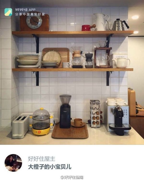 很多小厨房没有充足的空间添置柜子,这时候在墙上增加收纳隔板就是个不错选择。可以把锅、微波炉、调味品等物品放置在墙面收纳隔板上,再在隔板下面加个厨房挂杆,把刀、铲子、锅盖等挂起来,充分利用空间。