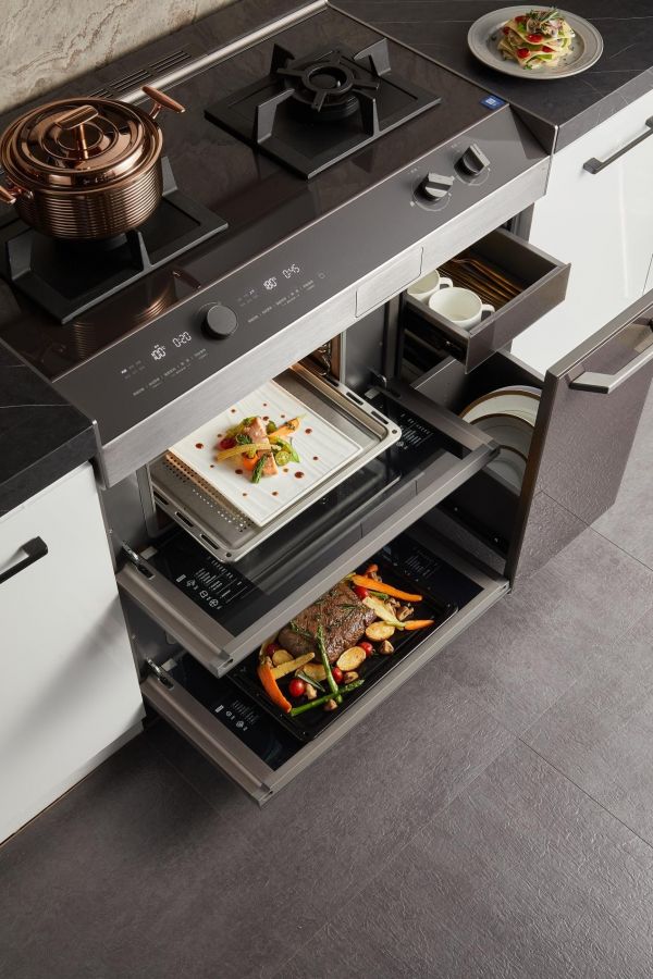 在烹饪立方的设计原理上,MK设计师充分汲取了意式美学的巧妙,以“推箱”式的安装方式,轻松嵌入橱柜,完成灶、蒸、烤、存多功能于一体,简洁利落,使用便捷。精致金属把手、精确到30°倾角的中控台、金属拉丝的纹理,无不体现以人为本的流畅烹饪动线,一推一拉之间,尽享意式优雅。