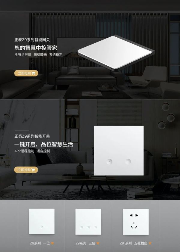 全系列家族单品,兼具科技美学与实用性能。Z9智能网关、智能开关插座、情景面板,采用黑白撞色设计,线条利落干净,时尚大气。其中智能网关产品,厚度仅7.8mm, “隐藏”天线设计,产品整体“薄”出了行业新境界,“美”出了格调新高度。