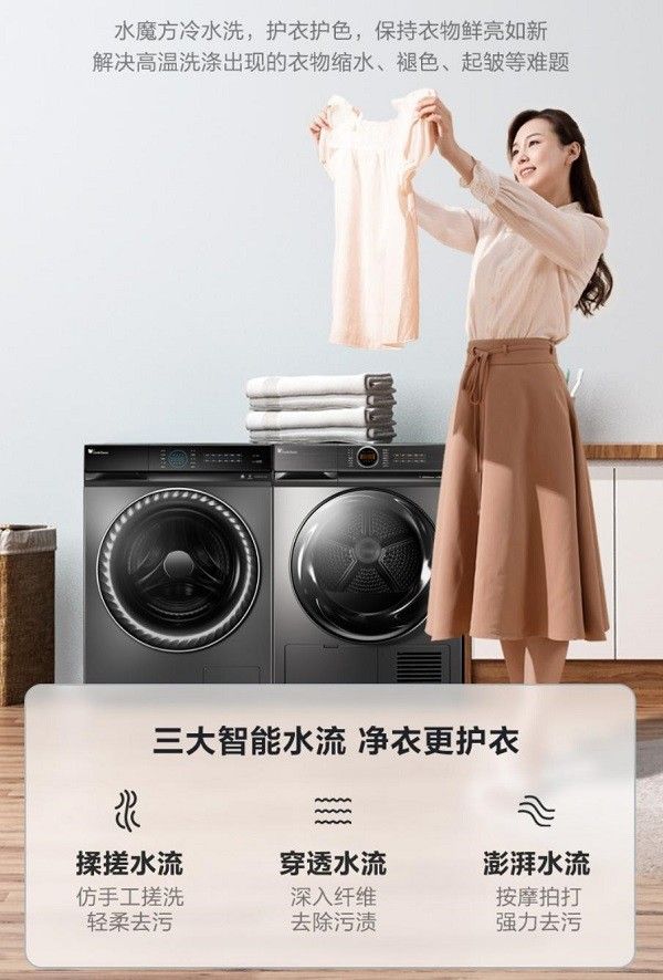 小天鹅洗烘套装是国内知名家电品牌小天鹅推出的高端洗烘产品,该套装中的洗衣机、烘干机在洗烘的设计上可以说完美解决了如今汉服洗护以及晾晒方面的诸多痛点。譬如在清洗方面,小天鹅洗衣机拥有独家“水魔方”技术。该技术能够通过对水流节拍和力度的控制,将洗衣机中的水流“搓揉水流”、“穿透水流”、“澎湃水流”三大智能水流,通过物理洗涤的方式对汉服进行由浅至深、由外至内的深层洁净。