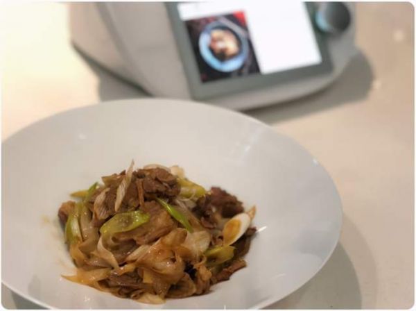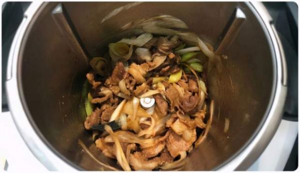 第二道菜做了葱爆羊肉,试了一下它的160度高温食谱。将油和羊肉放入主锅,以高温模式爆炒,再加入大葱、料酒、生抽、老抽、麻油、麻油、盐和糖,以2分/Varoma/反转/速度0.5拌炒。160度高温做出来的菜味道更香,也还是没有油烟,既健康又美味。