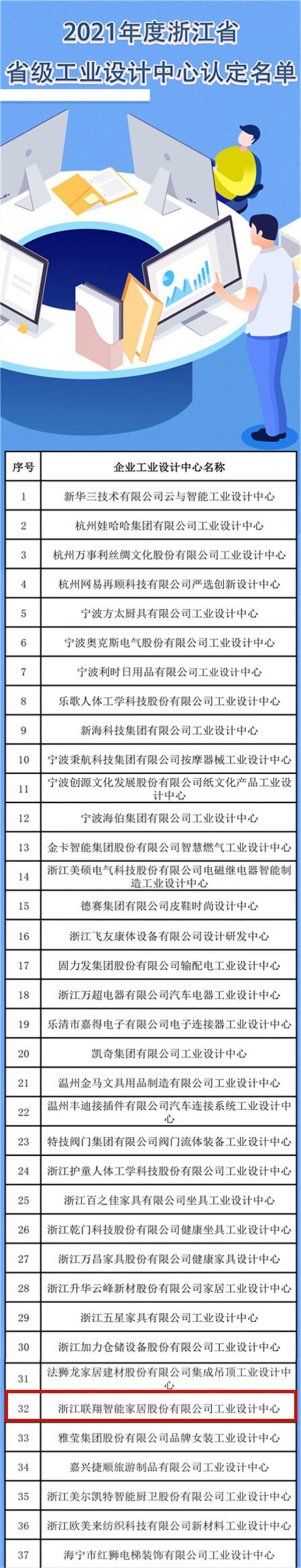 近日,浙江省经济和信息化厅发布了《关于2021年度浙江省省级工业设计中心认定和复核名单的公示》,浙江联翔智能家居股份有限公司榜上有名,成功入选!