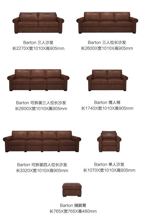 Barton系列沙发的款式,除了三人沙发的款式,可接受多种定制需求,包括四人位长沙发、三人位长沙发、可拆卸三人位长沙发、情人椅、单人沙发和搁脚凳,让它能够轻松融入各种户型空间。