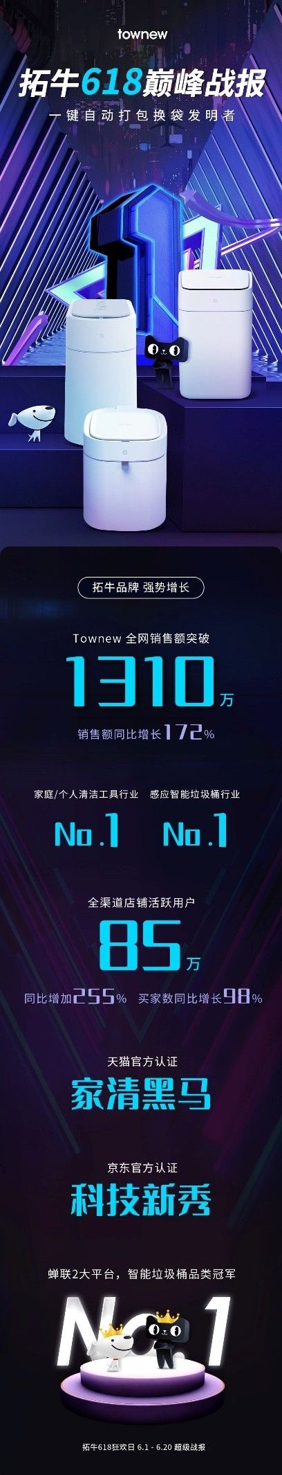 整个618活动,拓牛全网销售额突破1310万,同比增长172%,蝉联天猫、京东2大平台智能垃圾桶类目冠军,跻身家庭及个人清洁工具行业No.1,实现高销量、高增幅。一鸣惊人的实绩,不仅让拓牛评选为天猫、京东618新品牌中的“家清黑马”和科技新秀,也证明其顶配垃圾桶称号实至名归。