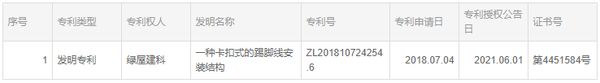 公告显示,蒙娜丽莎集团股份有限公司全资子公司广东绿屋建筑科技工程有限公司于近日取得国家知识产权局颁发的发明专利证书1项。