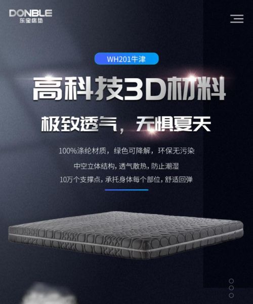 很多人夏天睡不着,是因为同一个位置睡久了会发热。有没有不发热的床垫?东宝床垫“牛津”选用3D透气网面,表面具有十万数量级的透气网孔,保持与人体接触面的舒爽透气,补充新鲜空气,达到快速散热的效果。