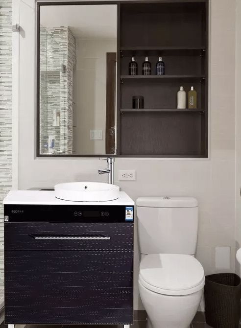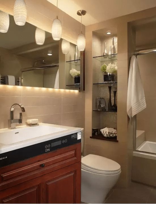 看看这样的卫生间设计,浴柜与热水器融为一体了,很气派、美观是吧