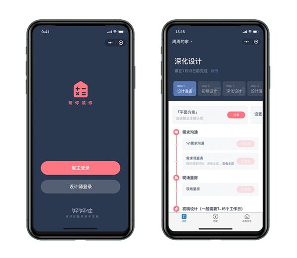 为了助力设计师高效管理项目,好好住还上线了「陪你装修」小程序。小程序内数据与好好住APP底层贯通,在APP内设置了「服务流程」与「服务亮点」的设计师,可在「陪你装修」小程序内轻松实现项目管理,实时把控、跟踪、推进自己的服务流程。