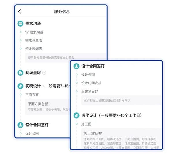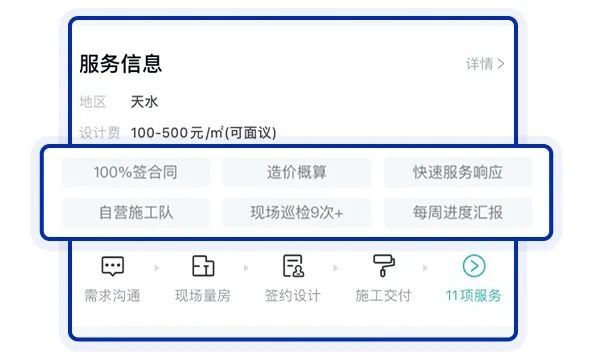 而《指南》在好好住APP内的呈现,则是设计师个人主页服务信息板块上所展示的「服务流程」和「服务亮点」两个模块。