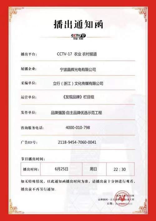 经过多次实地走访考察,多方数据整合汇总,“晶辉光电”不负众望,成功通过了层层严格审核,荣登央视双频道进行品牌展播。