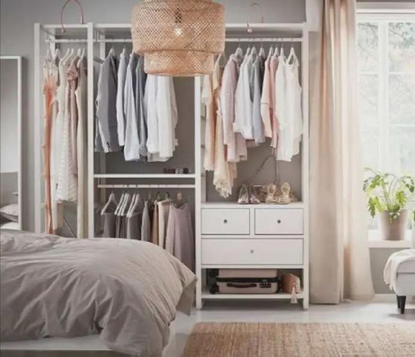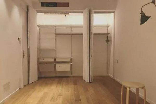 想省钱的话,直接做开放式的衣橱,靠墙安装几组搁架,然后在天花板上安装一个滑轨,装上帘子,拉上帘子的时候同样可以挡灰尘。