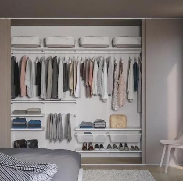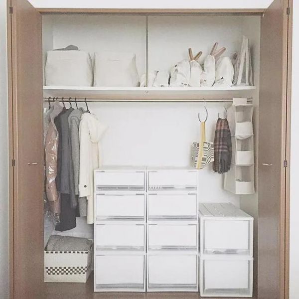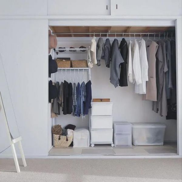 再或者像日本的壁橱一样,安装一块搁板和一根晾衣杆,其他用收纳盒装起来,成本也很低,几百块钱就能搞定。