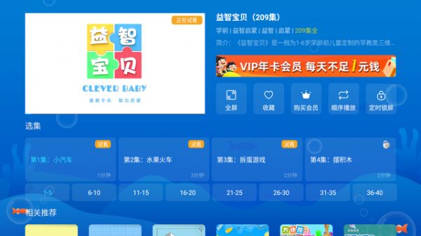 随便选择首页推荐的【益智宝贝】,可以先试看3集。其他软件可能是打开就需要付费开会员。当贝教育有“试看”权益,光是免费试看,就可以满足小朋友一整天了。清晰度还很不错,估计是1080P。