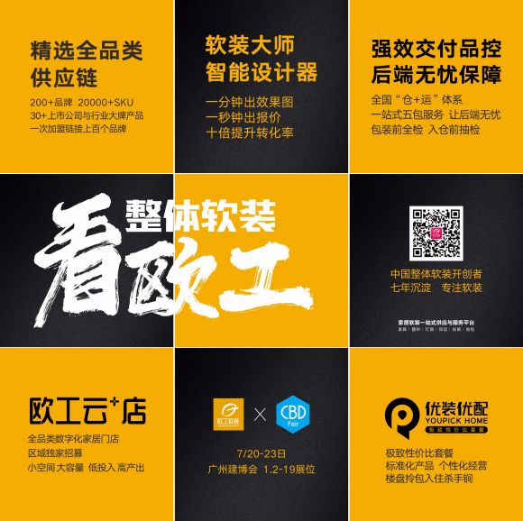 7月20日至7月23日,大家居建装行业的“冠军企业首秀平台”——广州建博会即将开幕!“家居软装一站式供应与服务平台”欧工软装将再次参展亮相,诚邀莅临A区1.2-19展位,携手开拓软装大未来。