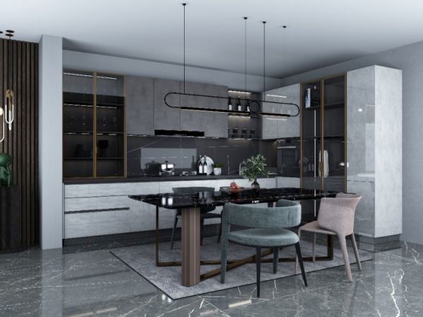 Starhomes星之家2021年新品白昼流星Ⅱ的餐厨空间是经典L型布局,顺畅地洗切炒动线,让下厨更加得心应手;云石纹理和超晶板色泽等精致细节流露艺术光采;大纹水磨石的点缀,轻盈浪漫,给人予另类的享受空间。