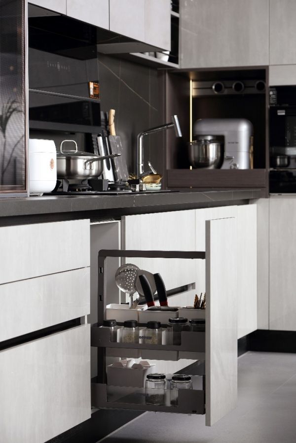 当然,一个合格的高效厨房绝对少不了功能配件。例如,Starhomes星之家2021年新品白昼流星Ⅱ所配置的多功能收纳拉篮,通过模块化收纳,让调味料等瓶瓶罐罐有安身之地,有效隔绝油烟,又释放更多台面空间,并且可通过中性盐雾96小时,防锈性能强;进口百隆导轨,更是可以正常使用十年。玻璃门高柜设计,以抽拉式设计,内设插座,小家电区,合理利用转角死角;内部空间合理分区,集操作、储酒、酒杯架、小工具收纳为一体。吸嵌橱柜烟机,则是行业首创,炫黑外观与橱柜融为一体,干净利落享受极简生活;开放式储物层板带灯条,营造优雅静谧的氛围,兼具收纳、照明与美观效果。转角拉篮,实现死角空间0浪费,让千锅不乱,即使藏在最角落里的东西也可以很方便的拿出来。
