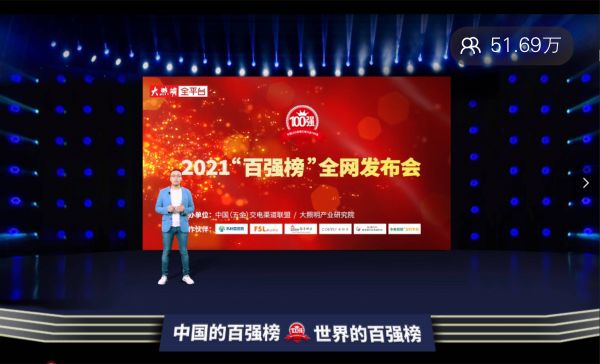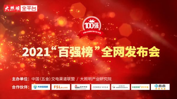 6月25日下午14时,我国LED照明灯饰行业年度盛事,由中国(五金)交电渠道联盟、大照明产业研究院联合主办的2021“中国LED照明灯饰行业100强”全网发布会(简称:2021“百强榜”全网发布会)盛大启幕。