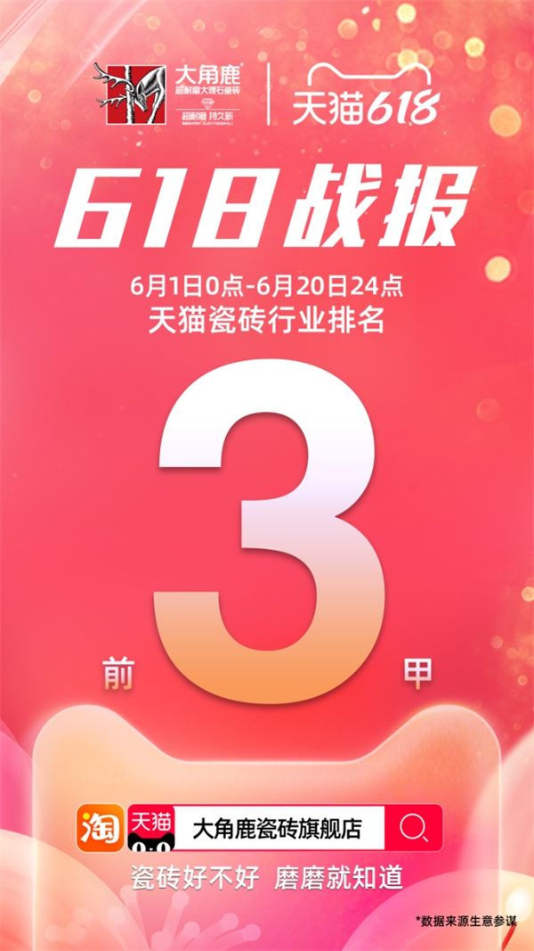 作为年度最受瞩目的电商节日之一,618大促在今年已经步入第18个年头。根据天猫官方数据,今年的“天猫618理想生活狂欢季”共聚集了25万品牌,为去年同期的2.5倍; 6月18日凌晨第1小时,天猫618成交额同比增长100%,不少品牌在天猫618迎来爆发。在瓷砖品类,大角鹿瓷砖凭借卓越的产品实力,力压多个知名品牌,荣登天猫618瓷砖行业销售榜的第三名!用真实的榜单成绩,展现大角鹿超耐磨瓷砖强劲的市场号召力。