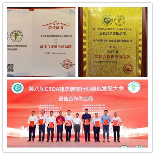 值得一提的是,在第八届中国建筑装饰行业绿色发展大会上,千年舟又双叒叕刷新品牌荣誉!喜获“中国绿色建筑装饰品牌最佳合作供应商品牌”的荣誉。