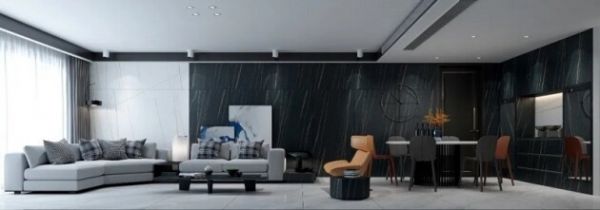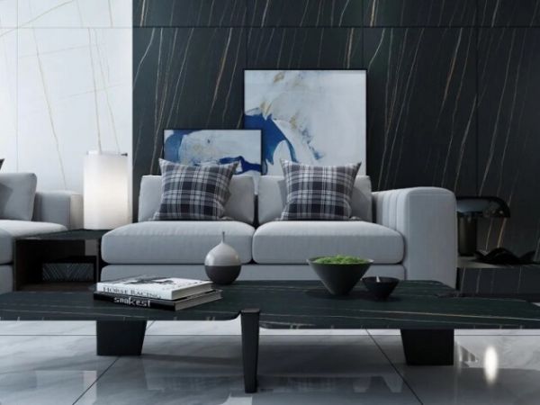 背景墙和茶几选用通体黑的哑光岩板产品,岩板应用非常广泛,除了传统的墙地面,还可以使用在家居橱柜台面,360度全方位的安全质量检测,大家可以放心大胆地用在家居上。