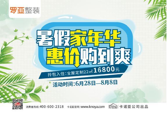 仲夏来袭,烈日炎炎,也是家居装修的旺季。这个夏天,罗亚整装的清爽套餐为你解决所有的家装烦恼,6月28日-8月8日,卡诺亚定制家居旗下的罗亚整装品牌,针对当前广受青睐的一站式拎包入住家装服务,诚意推出“暑假家年华,惠价购到爽”整装疯抢季让利活动,现代全屋套餐¥16800、简欧全屋套餐¥22800、橱柜套餐¥4680三大套餐钜惠来袭,让消费者实现一家购齐、一省到底。