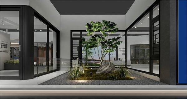 新标展馆以半开放式设计,高级灰为主色调,灰白色系相配,以醒目的新标蓝点缀,交融其间,在光影交换中,演绎极简轻奢前沿设计美学,独具风格特色,形象地诠释空间魅力。