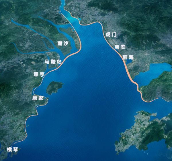 观察粤港澳大湾区版图会发现,虽然大湾区范围覆盖9+2城市的广大区域,但实际上,湾区的价值重心明显以珠江口两岸的岸线向腹地递减。四大核心城市广深港澳在这条岸线上,三大国家级新区(广东自贸区三大片区)也在这条岸线上。近年来两岸城市的热点区域,如深圳的宝安、珠海的唐家湾新城、东莞的虎门、中山的翠亨新区,广州的南沙,均靠海而兴。