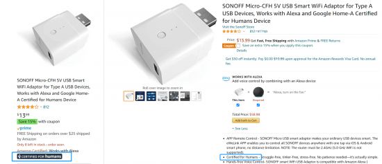 目前,酷宅科技已帮助首批合作伙伴完成部分产品的CFH认证,以SONOFF Micro-CFH USB无线适配器为例,通过 CFH 认证的产品在亚马逊电商上架后,在搜索结果页及产品详情页显示CertifiedFor Humans认证徽章及认证文案,更抓人眼球,同时凭借产品给用户带来的优异体验,受到了市场的热烈追捧。