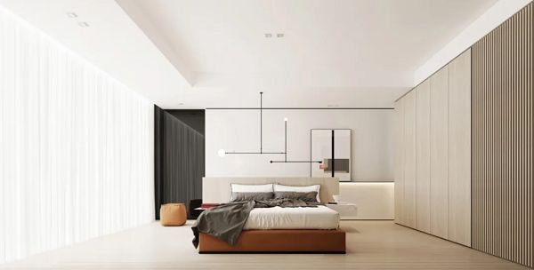 极简卧室就像白描,清晰克制的线条里,言有尽而意无穷,自有一股令人沉溺的大气深沉,配合着天然材质,质朴自然,返璞归真。原木装点,照明为设计增添了微妙的艺术元素,将城市和自然轻松结合在一起。